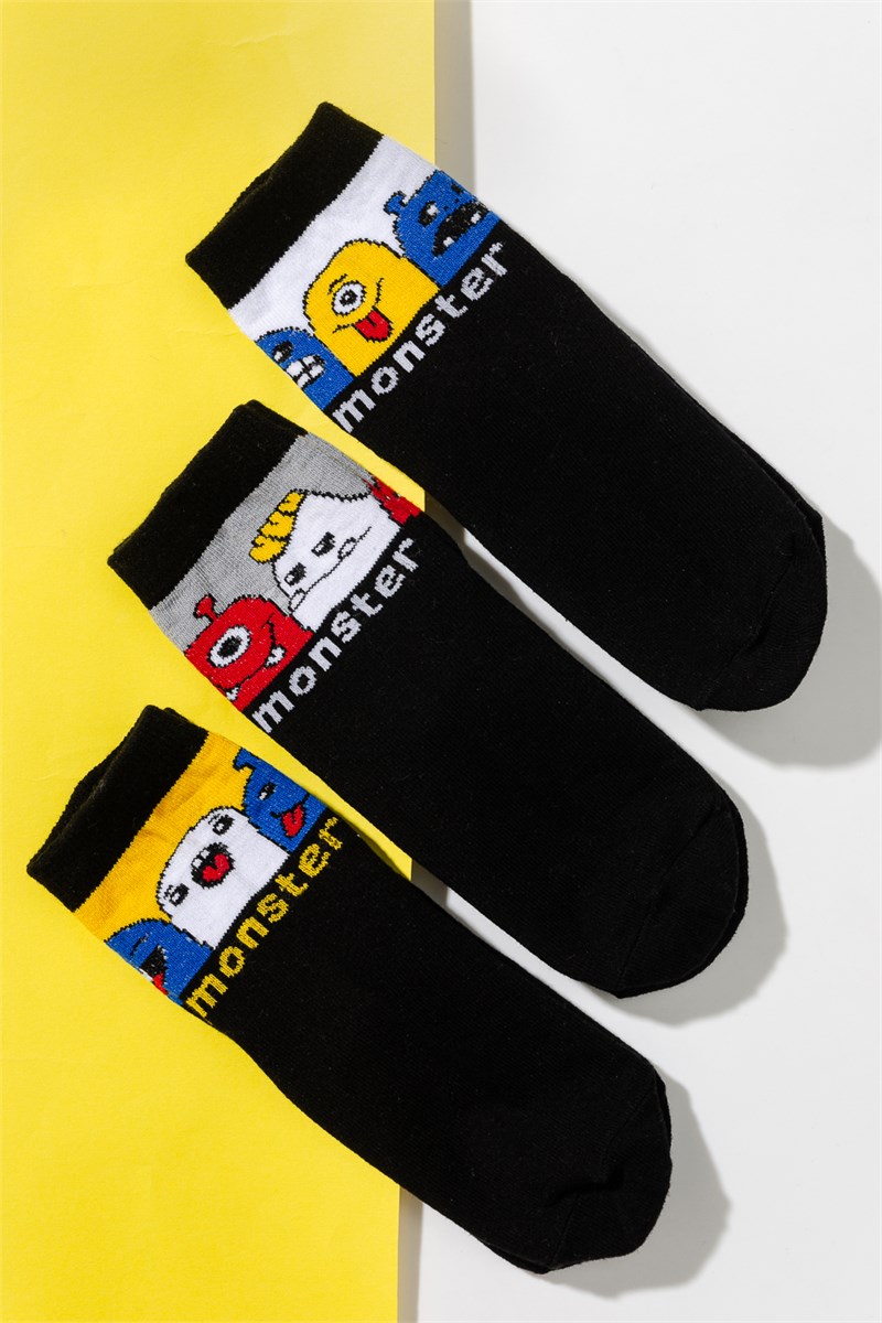 Комплект детских носочков из трех пар. На верхней части носка надпись monster и забавные рожицы монстриков.
