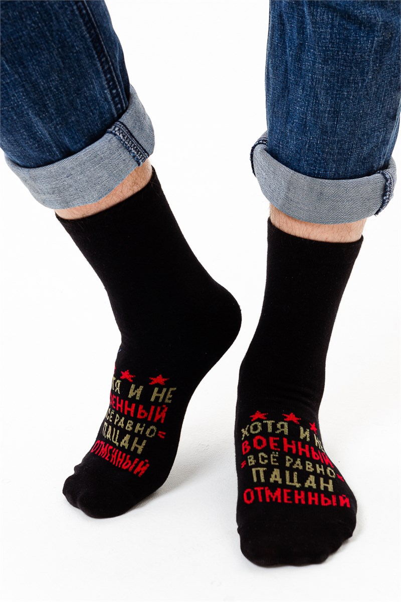 Оригинальные мужские носки с надписью Хотя и не военный, все равно пацан отменный в верхней части стопы. В комплекте 1 пара.