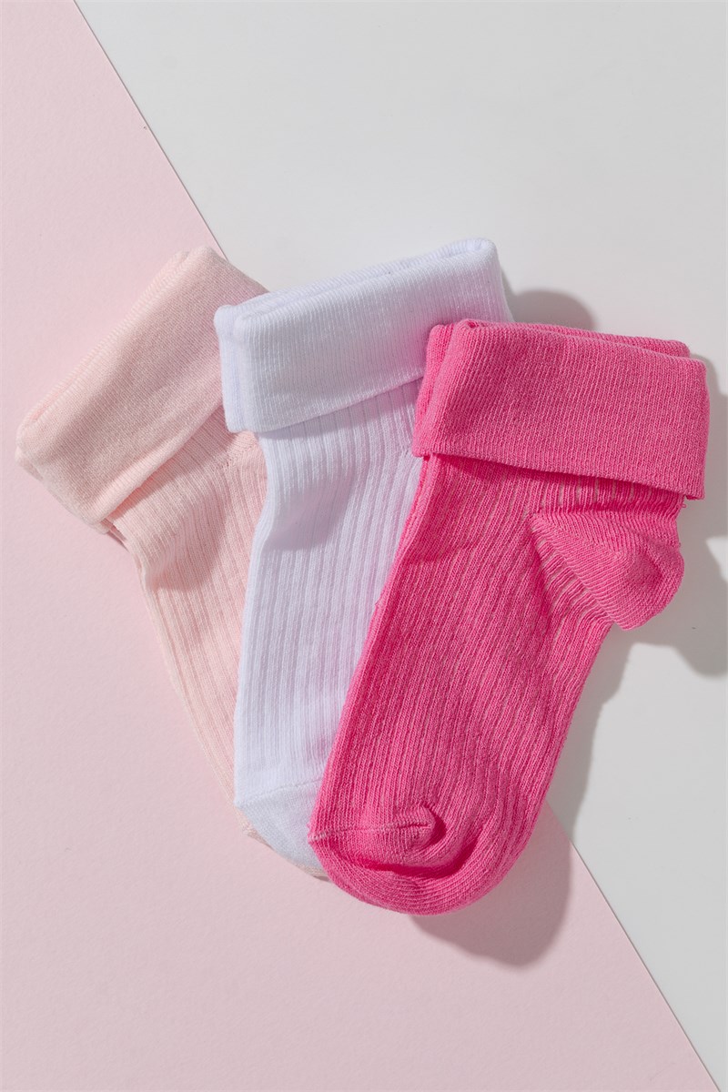 Набор малышковых носочков Соло. В комплекте 3 пары в розовых или голубых тонах. Носки выполнены узором резинка, верхняя часть носка с отворотом.