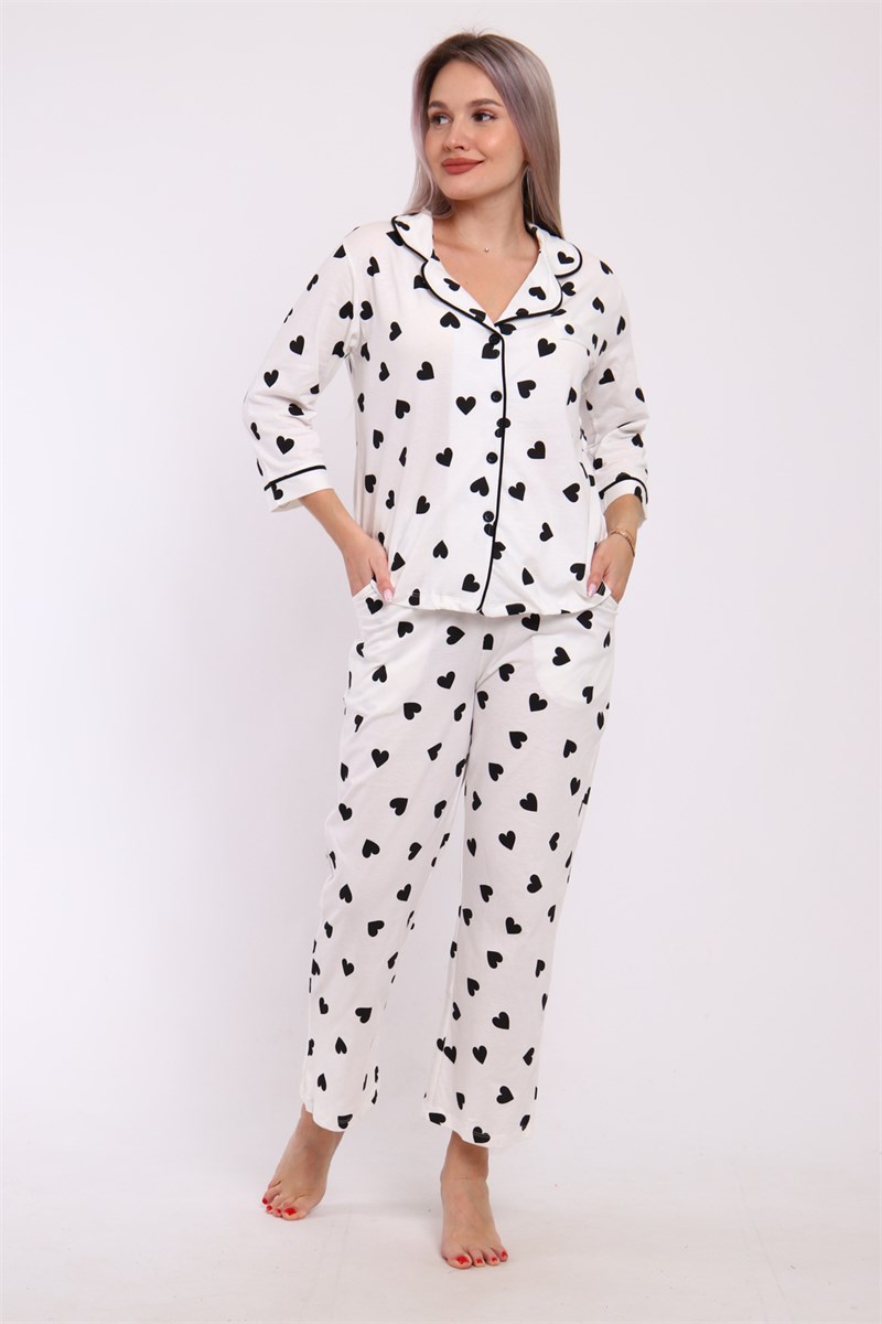 Пижама женская с брюками. Рубашка прямого, свободного кроя на пуговицах с имитацией кармана на груди. Воротник фигурный. Кроя полочки, рукав и воротник обработан внутренней окантовкой. Брюки с карманами, длина по щиколотку.