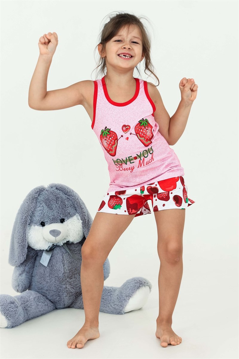 Яркая клубничная пижамка для девочек, состоящая из майки и шорт. Майка украшена оригинальной печатью, шорты на широкой резинке с закруглениями.