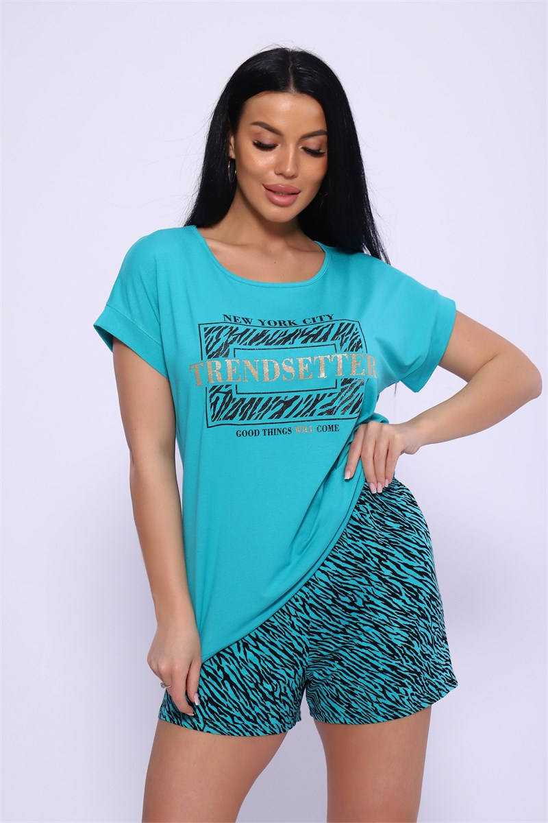 Модель свободного силуэта состоит из футболки со стильным оригинальным принтом и шорт. Костюм изготовлен из комфортной, дышащей трикотажной вискозы, выдержит многократные стирки, подойдёт на любой возраст и фигуру. Дома в нём вы себя очень уютно будете чувствовать, а также этот костюмчик замечательно впишется и на отдыхе, и на даче.