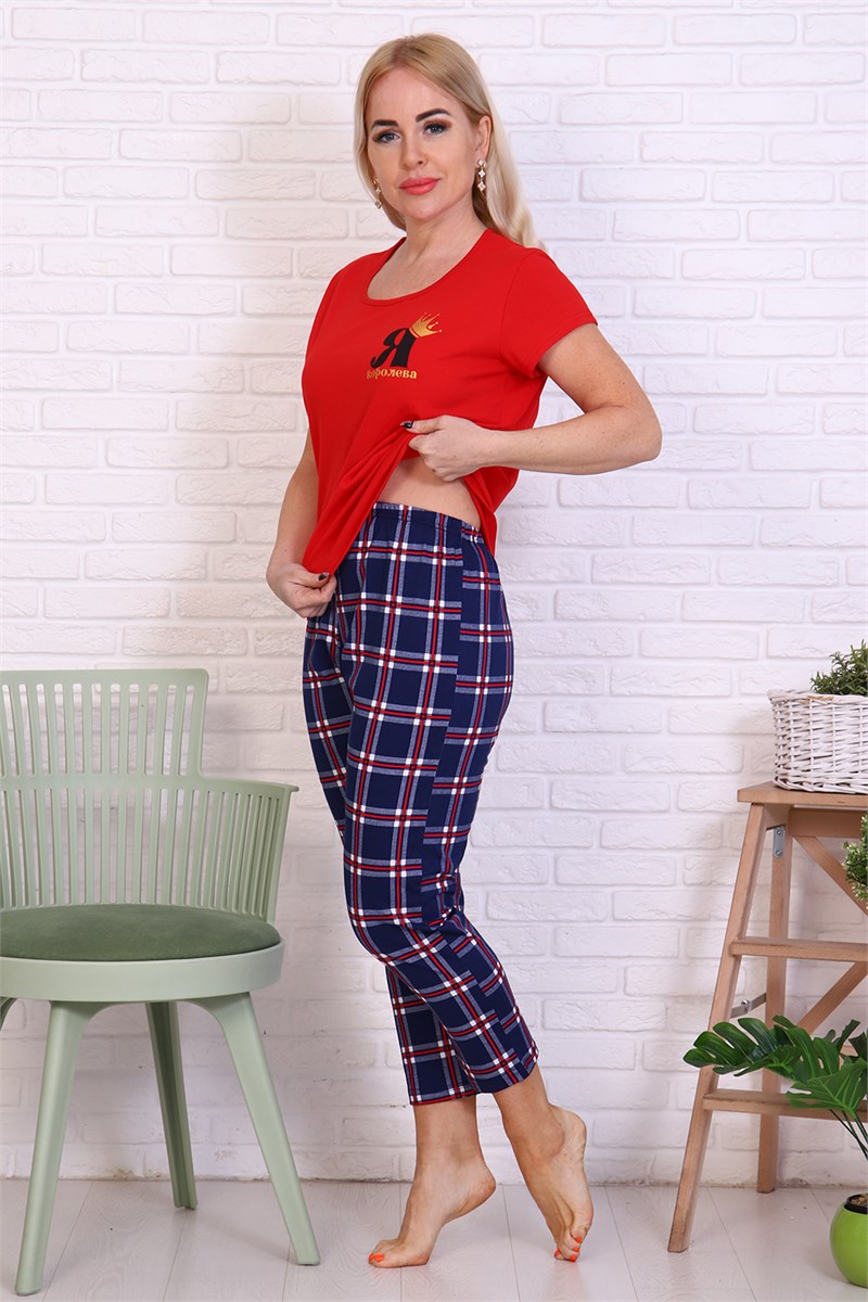 Женская пижама с укороченными брюками в клеточку. Футболка красного цвета с коротким рукавом, на полочке оригинальная печать в виде буквы с короной.
