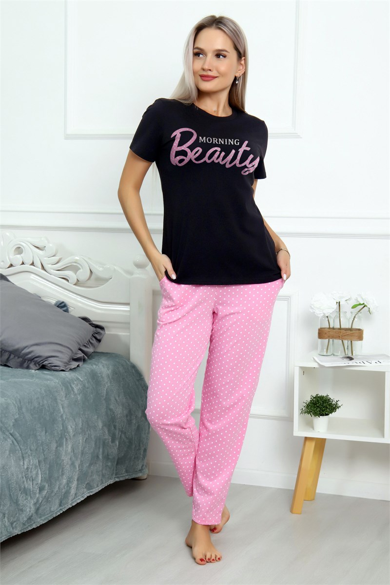 Пижама женская домашняя состоит из футболки и брюк. Футболка свободная, длиной до линии бедер, плечо спущенное, рукав втачной короткий. Горловина с обтачкой. На середине переда оригинальный принт. Брюки длинные, свободные без карманов. Пояс на резинке.