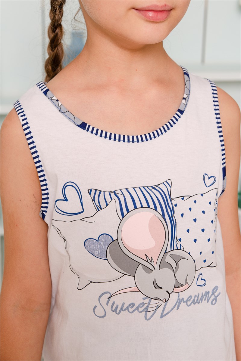 Пижама детская состоит из майки и бриджей. Майка с принтом полуприлегающего силуэта, бриджи свободные, без карманов низ обработан декоративной краеобметочной строчкой.