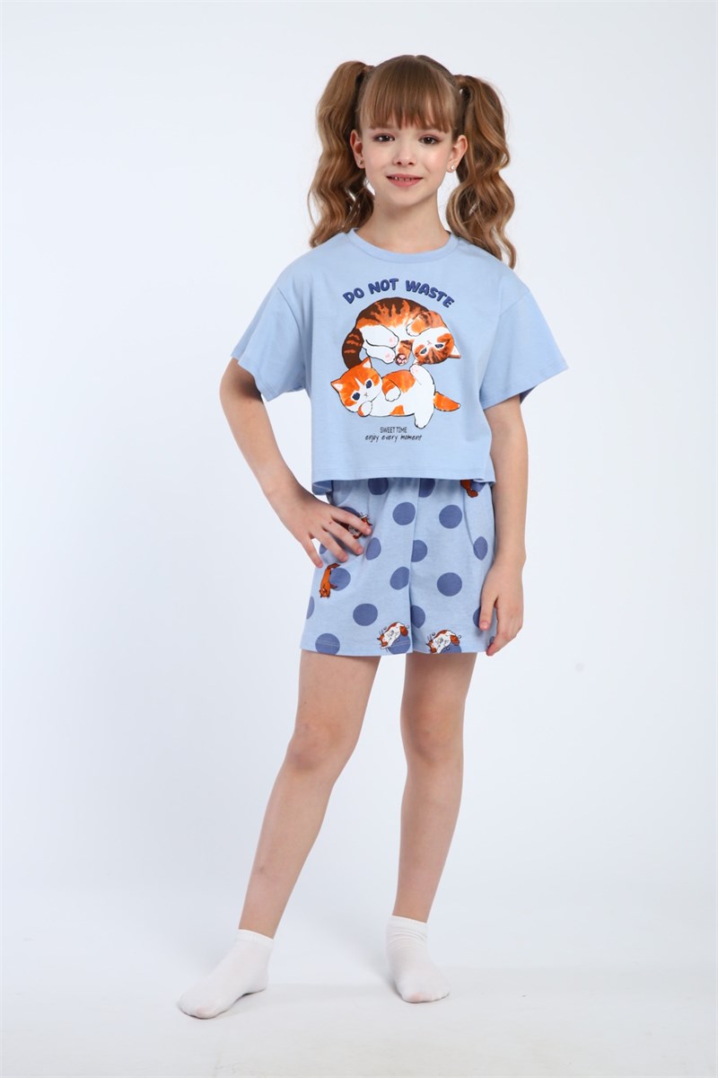 Комфортная пижама для девочки с оригинальным принтом. Пижама детская состоит из футболки с забавными котятами и шорт. Дизайн ткани позволяет использовать пижаму не только для сна, но и как костюм для дома. Модель пижамы не сковывает движения ребенка во время сна. Покрой футболки свободный, шорты классические без карманов. Пижама выполнена из 100% гипоаллергенного хлопка, что позволяет коже ребенка дышать во время сна. Прекрасный подарок на праздники.