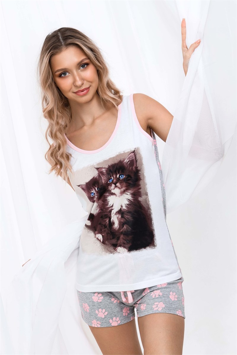 Пижама из кулирки майка + шорты. Светлая майка с розовой окантовкой, принт в виде котят, серые вставки с кошачьими следами. Короткие серые шорты с узором в виде следов, розовая окантовка карманов, шнурок на поясе