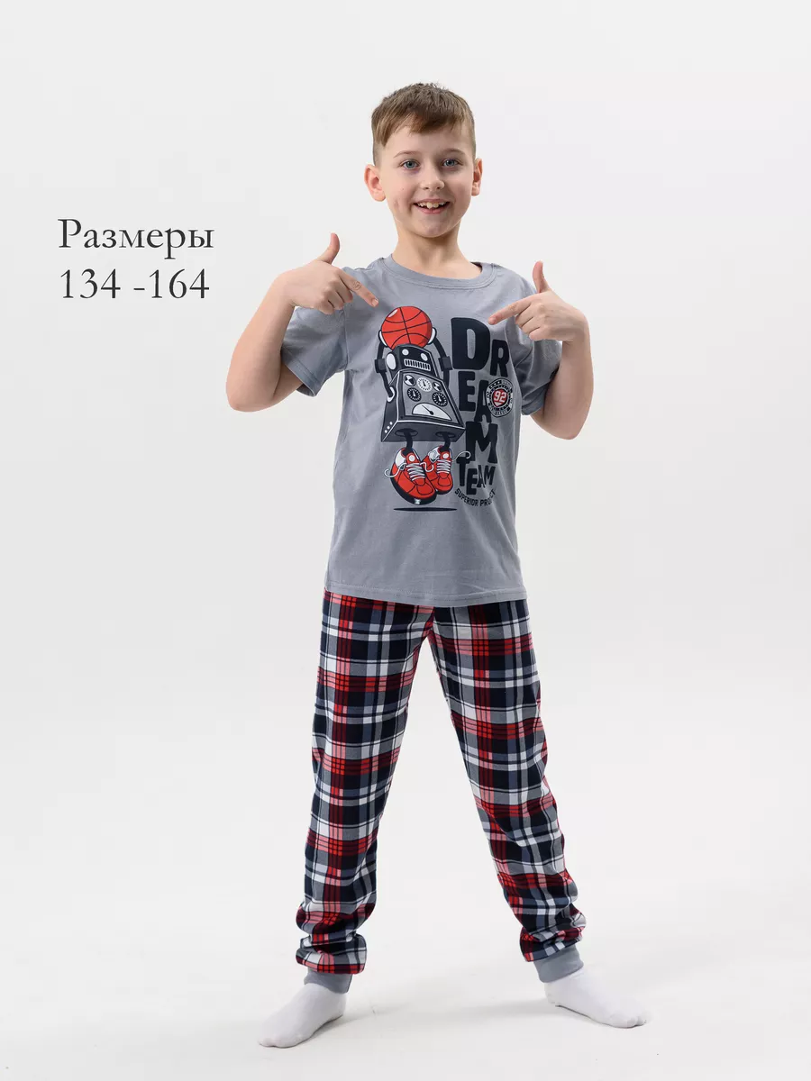 Пижама для мальчика детская, состоящая из футболки и брюк с манжетами, идеальная домашняя одежда. Комплект без карманов из натурального хлопка украшен устойчивой печатью робот. Пижамка с клетчатыми штанами согревает, даже если ребенок ворочается и раскрывается во сне, а также создает ощущение уюта, ребенок спит глубже и реже просыпается. Подходит для полных и худеньких, высоких и невысоких детей. Молодежная удобная двойка с крутым принтом создаст стильный образ для фотосессии или спортивной тренировки. Также стильные пижамы для мальчиков и подростков создают хорошее настроение, их можно носить как домашний или летний пижамный костюм без карманов и застежек, для комфортного сна ребенка. Пижама на мальчика подростка с удобной посадкой и нетугой резинкой, ярким и модным молодежным стилем для детей и подростков. Тысячи довольных покупателей доверяют нам свой выбор благодаря нашим низким ценам, отличному пошиву, высокому качеству и интересным цветовым решениям.