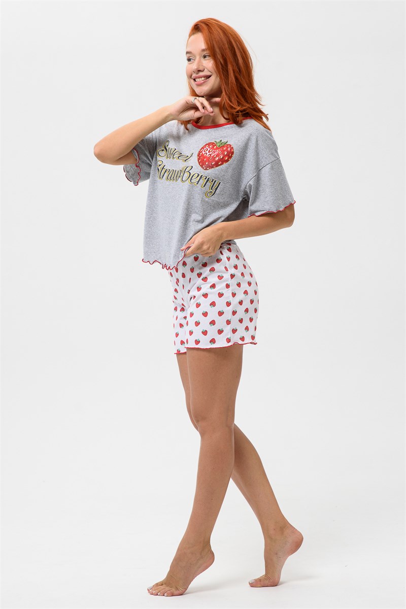 Весёлая, лёгкая пижамка сладкая клубничка. Очень свободный крой, спущенная пройма. Может использоваться как домашний костюм. Футболка х/б 50%, ПЭ 50%; шорты х/б 100%