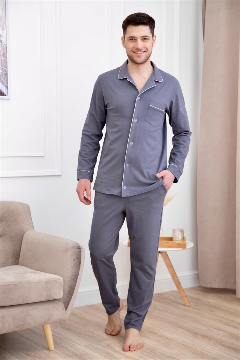 Пижама с брюками незаменимая вещь в зимнем гардеробе любого мужчины. Однотонная пижама с отложным воротничком, застежкой на пуговицы, стильной окантовкой - одна из самых трендовых позиций. Пижамный костюм оверсайз станет отличным подарком. Комплект со штанами подойдет для: дома, сна, отдыха и т.д