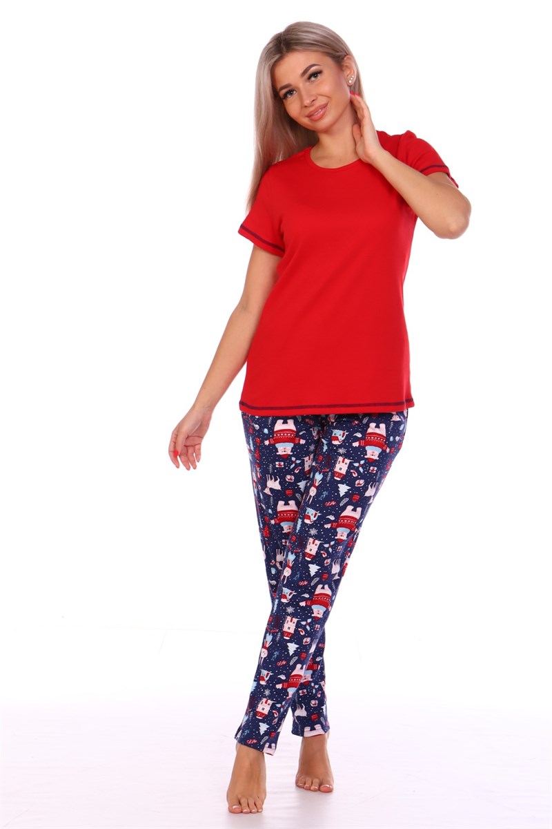 Комплект состоит из футболки полуприлегающего фасона с отрезным рукавом и длинных брюк с карманами по бокам. Комфортную и удобную посадку брюк обеспечивает широкая поясная резинка. Ткань интерлок.