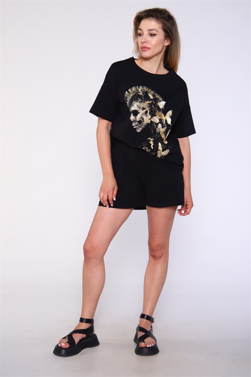 Пижама свободного кроя с шортами и футболкой. Футболка с вточным, спущенным рукавом и глянцевой печатью в стиле шелкографии. Шорты на резинке с карманами.