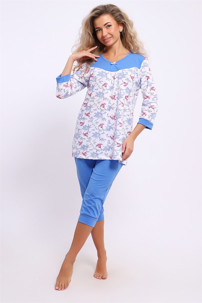 Пижама из натуральной белоземельной хлопковой кулирки, выпускается в большом диапазоне размеров с 50 до 64. Удобная посадка, нежное сочетание цветов.