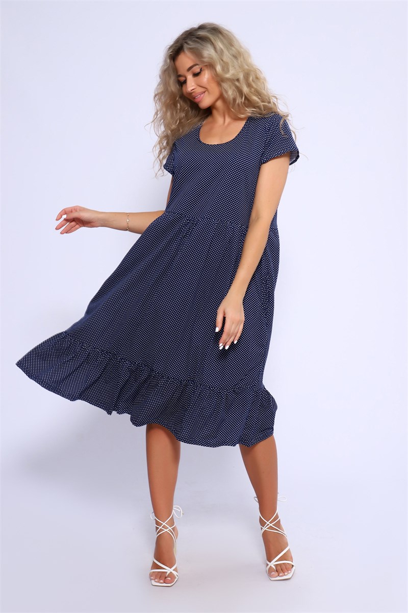 Свободное платье с короткими рукавами и двухъярусной юбкой на сборке. Карманы в боковых швах.