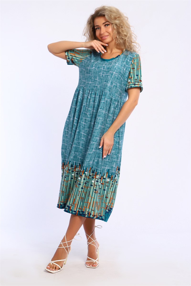 Платье с юбкой на сборке и короткими рукавами. В боковых швах удобные карманы.