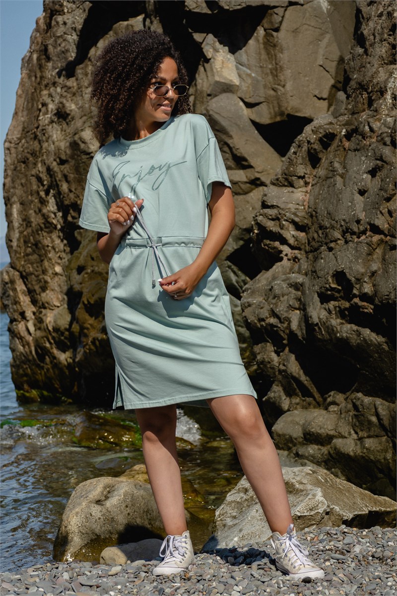 Платье прямого силуэта с кулисой по линии талии. Длина изделия чуть выше колена, по бокам разрезы. Ворот изделия круглый обработан планкой. Пройма спущенная, рукав короткий.