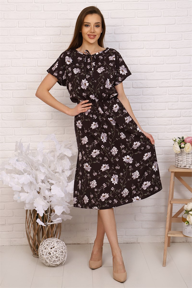 Летнее лёгкое платье из тонкой ткани с цветочным принтом. Модель длиной чуть ниже колена, отрезная по линии талии, с напускным верхом и коротким цельнокроеным рукавом. В поясе мягкая резинка. На округлой горловине небольшой вертикальный разрез на завязках. Удобное платье на каждый день.