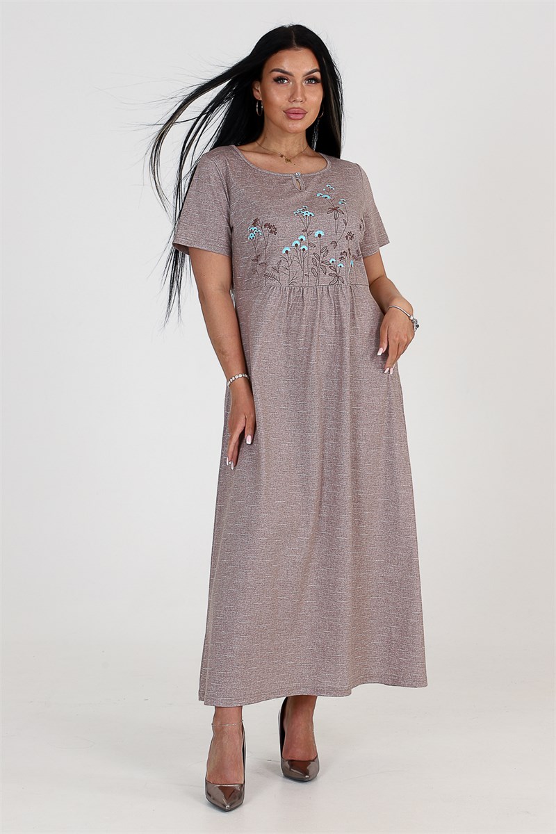 Платье женское из кулирки. На полочке и спинки кокетка. На кокетке расположена печать. Рукав втачной. На полочке и спинки в области талии небольшая сборка.