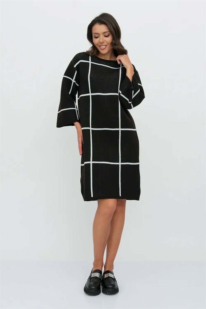 Женское трикотажное платье свободного силуэта. Вырез горловины круглый, рукава втачные длиной 7/8. Платье выполнено жаккардовым переплетением, образуя геометрический рисунок-клетка.