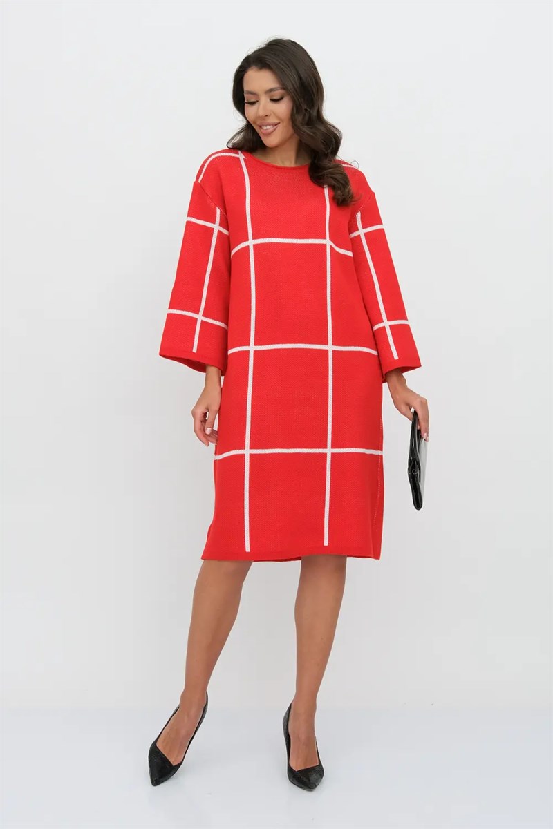 Женское трикотажное платье свободного силуэта. Вырез горловины круглый, рукава втачные длиной 7/8. Платье выполнено жаккардовым переплетением, образуя геометрический рисунок-клетка.