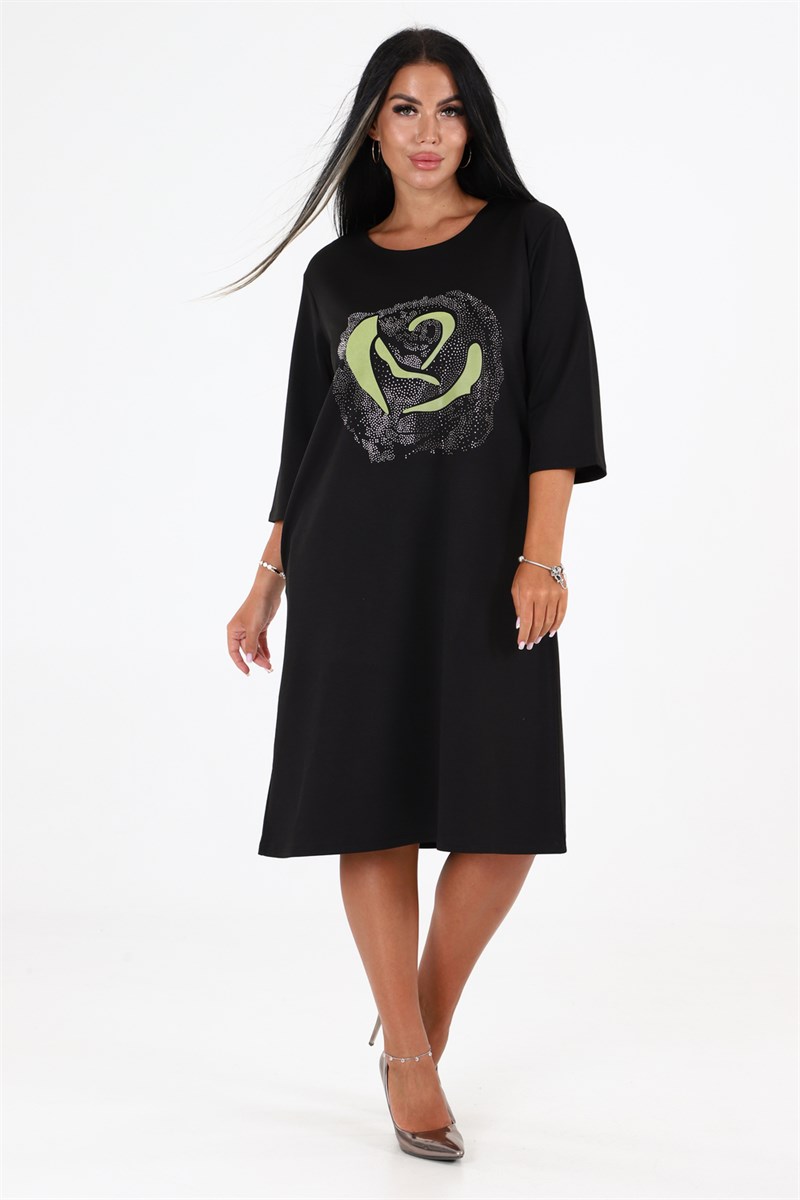 Особое внимание стоит обратить на прекрасную деталь полочка платья, украшенная шелкографией в виде розы и стразами. Этот изысканный элемент придает платью изысканность и элегантность, делая его неповторимым акцентом вашего образа.