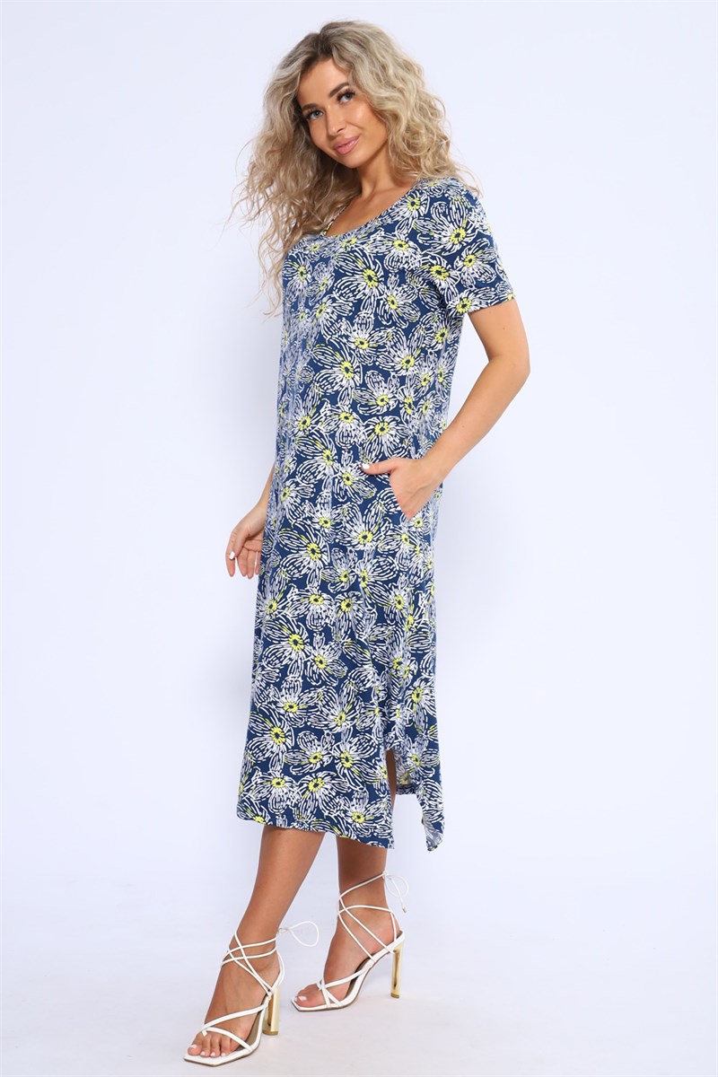 Платье женское из натуральной хлопковой кулирки, удлиненное с фигурными вырезами в нижней части бобковых швов. Рукава вшивные короткие, есть боковые карманы. Восхитительный рисунок на ткани в виде контурных ромашек.