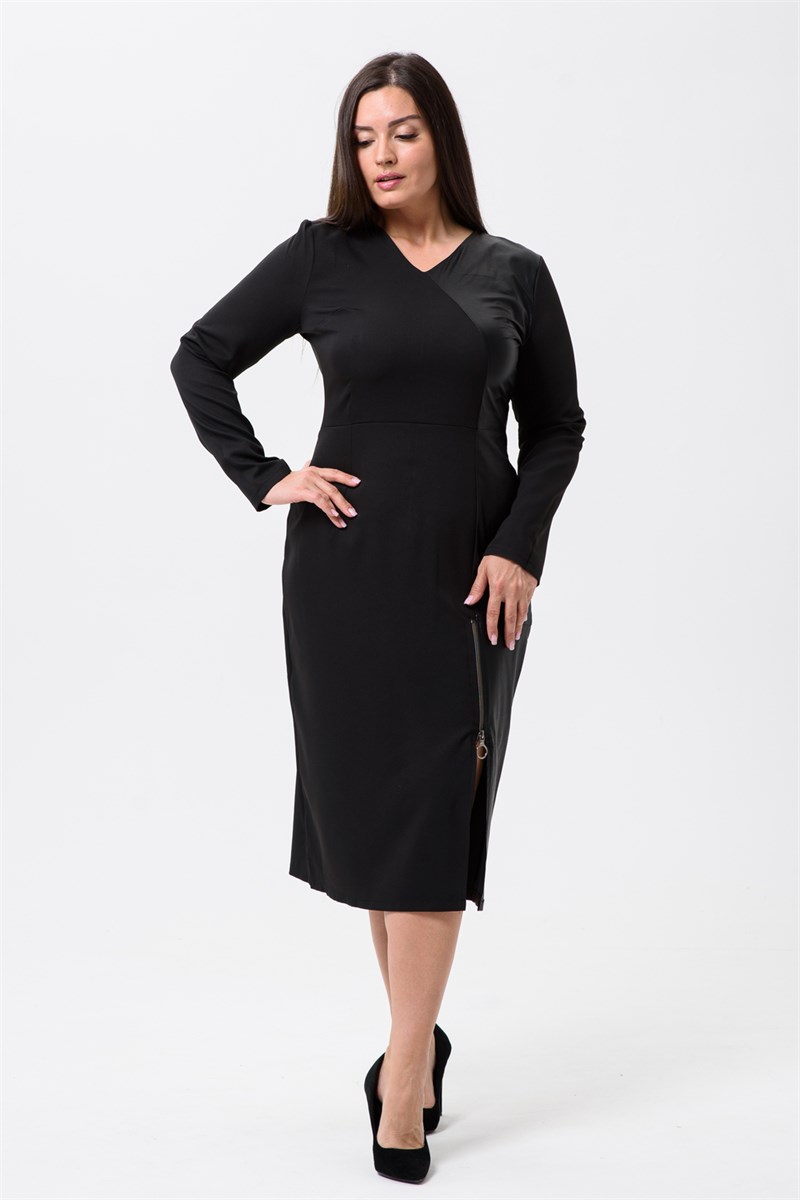 Изящное черное женское платье. Данная модель приталенная, выполнена в классическом стиле, рукав длинный, горловина v-образного выреза. Платье дополняют разрез снизу и молния над ним, вставка из эко-кожы и ремень на талии с круглой застежкой, что придает образу капельку дерзости. Такое платье послужит для любого повода, как деловое на работу, как вечернее и как праздничное. Изделие больше подходит для девушек с фигурой песочные часы.