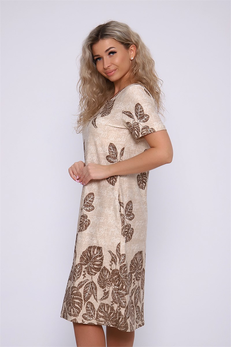 Платье полуприлегающего силуэта с короткими рукавами и карманами в боковых швах.