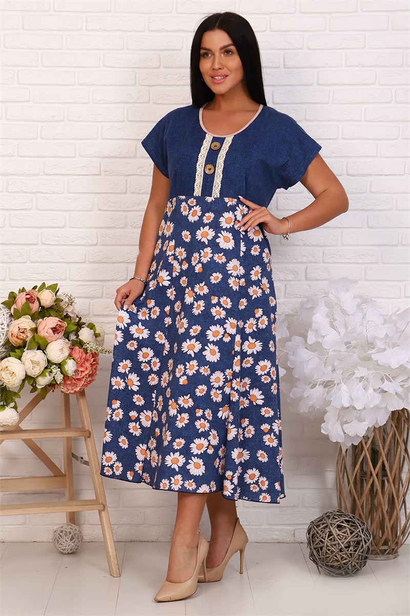 Платье женское из ткани кулирка 100% хлопок. Платье со спущенным рукавом, кокетка однотонная. Отделка на планке натуральным кружевом с двумя пуговицами кокос. Низ расклешен, платье удлиненное. Для повседневной носки, дома и отдыха. Сохраняет цвет и форму после стирки. Фасон очень комфортный