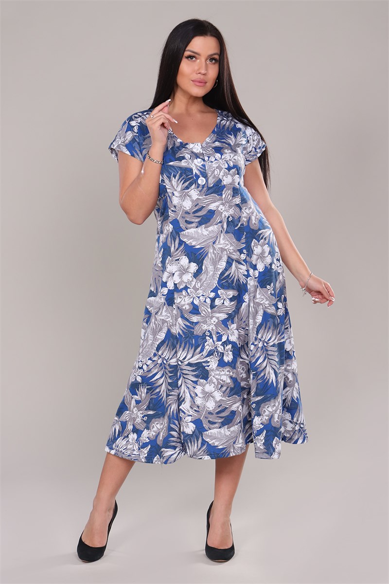 Платье женское удлиненное со спущенным рукавом, на полочке подрез, планка на трех декоративных пуговицах, внизу расклешение. Рисунок ткани красивый, насыщенный. Модель придает легкость, изящность, подойдет на каждый день, для прогулки и дома.