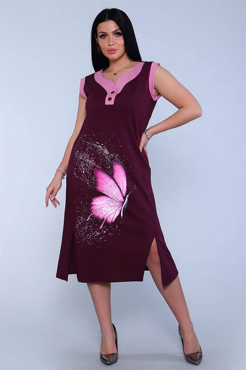Платье - туника полуприлегающего силуэта без рукавов. Горловина отделана обтачкой, переходящей в планку из отделочной ткани контрастного цвета на застежке из 2-х пуговиц V-образной формы. Изделие имеет два боковых разреза, смещенных на перед на полочку по косой линии. Пройма рукава отделана обтачкой из отделочной ткани. На полочке печать в цвет отделочной ткани с легкими яркими принтами. Длина платья чуть ниже колена. Широкий размерный ряд с 46 до 62 размера. Яркие расцветки принтов делают модель актуальной на сезон весна-лето 2023. Свободный покрой платья прекрасно подходит беременным. В этом нарядном и удобном платье, Вы будете чувствовать себя комфортно в любой обстановке: на прогулке, дома, в отпуске, на пляже, на даче и на любом празднике!