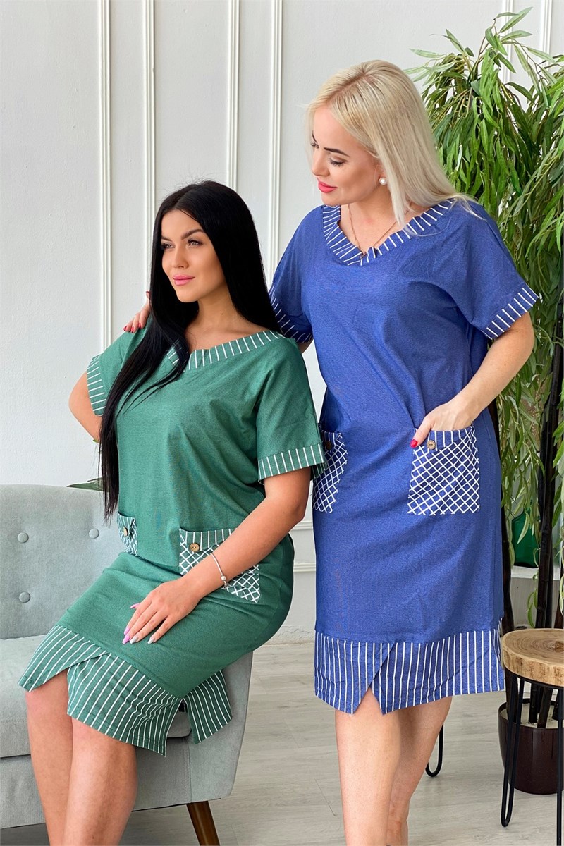 Платье прямого силуэта с цельнокроенным коротким рукавом на манжете. Вырез горловины спереди и сзади Y-образный. Обтачки горловины, накладных карманов, низ изделия и манжеты рукавов из отделочной ткани в полоску, накладные карманы на полочке в клетку