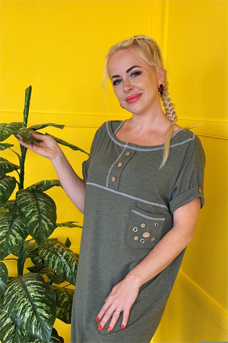 Платье женское прямого силуэта. На полочке и спинке кокетки. Рукав цельнокроенный с притачной манжетой на пуговице. На кокетке полочки планка с тремя декоративными пуговицами. На полочке нагрудный карман с тремя люверсами и четырьмя пуговицами. Шов притачивания нижней части платья, швы притачивания кокеток, планки и горловина отделаны контрастной декоративной строчкой. На нижней части спинки шлица на двух пуговицах.