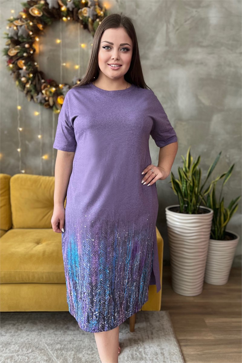 Платье прямого силуэта, с округлой горловиной, с разрезами в нижней части боковых швов. Рукав короткий. Горловина обработана обтачкой из основного полотна. На модели 52 размер