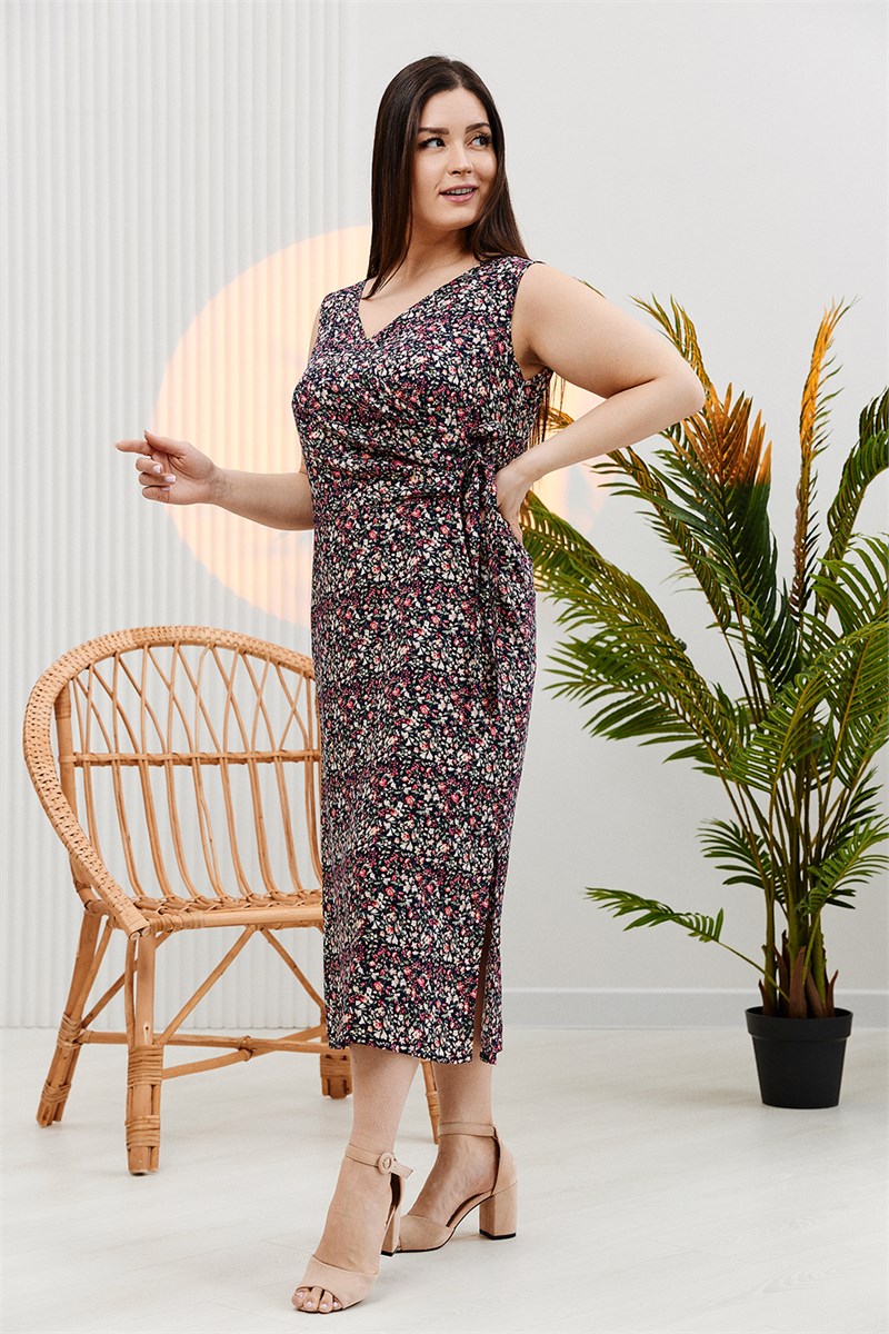 Платье женское полуприлегающего силуэта. Верхняя правая часть полочки со складками запахивается на левую. Прилегание по талии регулируется завязками. От линии бедер платье прямое с боковыми разрезами. В лекалах учтена незначительная усадка ткани после стирки.