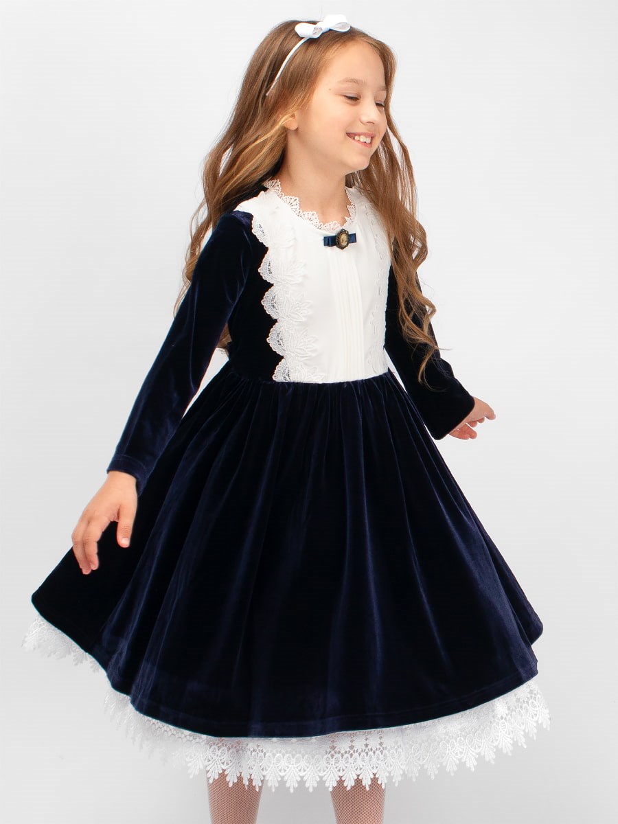 Очаровательное платье для девочки СольПерец из бархата, с отрезной кокеткой. Платье декорировано белой кружевной окантовкой и дополнено съёмной брошью. Износоустойчивый материал позволит надолго сохранить форму и привлекательный внешний вид изделия. Идеальный выбор для создания стильного, школьного образа. Платье без подъюбника. Подъюбник арт SP0111 можно приобрести отдельно для дополнения образа.