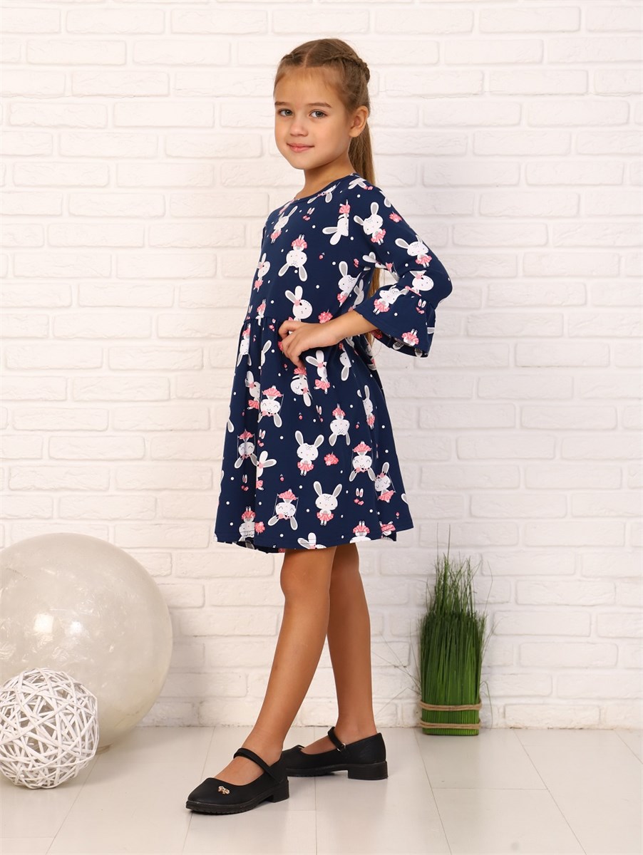 Платье для девочек дошкольного и младшего школьного возраста, из трикотажного полотна кулирка с лайкрой с рисунком. Силуэт прилегающий, отрезное и расклешенное от линии талии, рукав 3/4 втачной одношовный. По низу рукава широкий волан, выполненный из основного материала. Срез горловины окантован.
