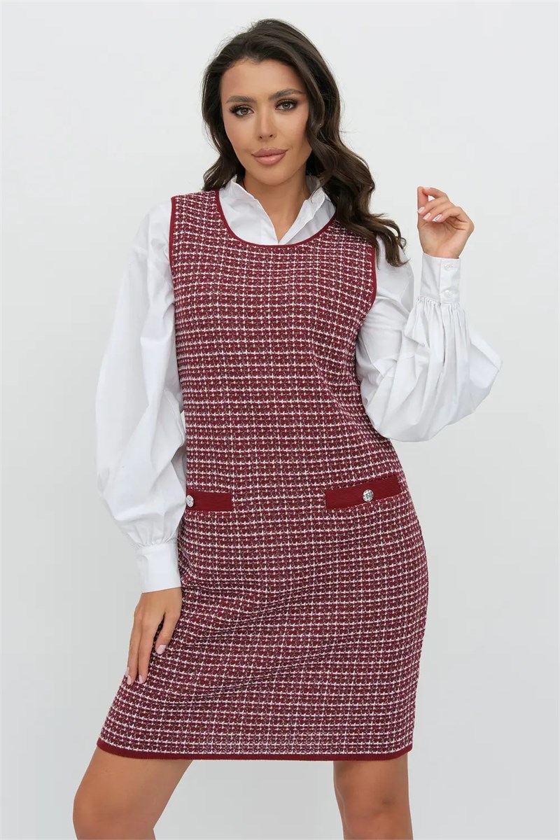 Вязаное женское платье-сарафан полуприлегающего силуэта. Два кармана с листочкой и пуговицей. Выполнено жаккардовым структурным переплетением рисунок клетка. Платье-сарафан для офисного, повседневного и делового стиля,  будет отлично сочетаться с водолазками, рубашками, блузками, джемперами или футболками.