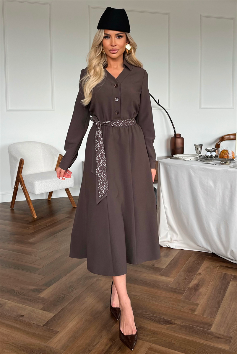 Повседневное платье приталенного силуэта из плательно-костюмной ткани.V-образная горловина оформлена отложным воротником на стойке. По переду планка с застежкой на петли и пуговицы. Длинный втачной рукав оформлен притачной манжетой. Юбка состоит из шести клиньев. В боковых швах функциональные карманы. Модель отрезная по линии талии присборена на резинку. Платье дополняет пояс с отделкой. Рекомендуемая стирка при t не более 30°. Длина изделия: 123 см. Длина рукава: 62 см. Ткань: плательно-костюмная. Рост фотомодели: 168 см Размер фотомодели: 42