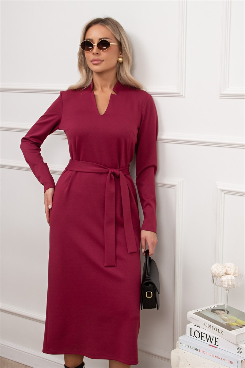 Лаконичное платье прямого силуэта изготовлено из трикотажного полотна. V-образная горловина с цельнокроеной стойкой. Длинный втачной рукав. Низ прямой, сзади шлица. Пояс из основной ткани в комплекте. Рекомендуемая стирка при t не более 30°. Длина изделия: 118 см. Длина рукава: 61 см. Ткань: трикотаж Рост фотомодели: 168 см Размер фотомодели: 42