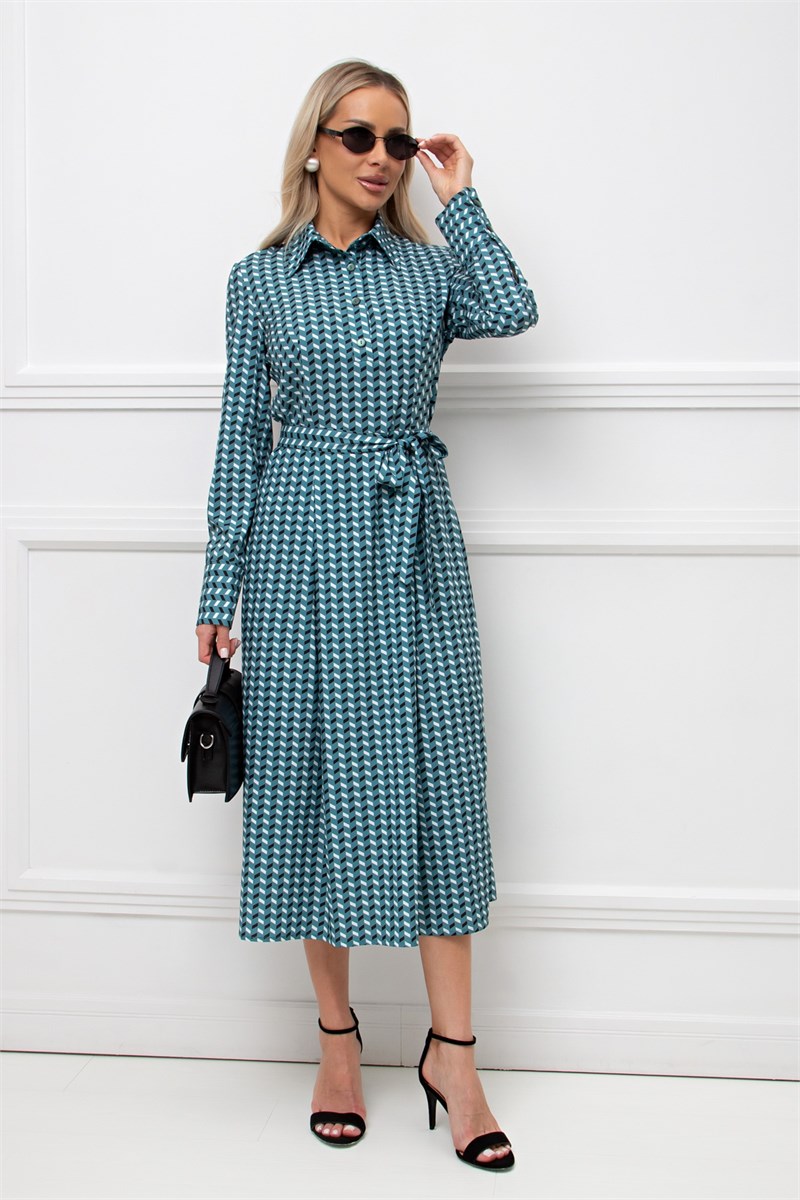 Женственное платье приталенного силуэта. Горловина оформлена отложным воротником на стойке. По переду втачная планка с застежкой на петли и пуговицы. Длинный втачной рукав оканчивается притачной манжетой. Модель отрезная по линии талии, с боку застежка на потайную молнию. Юбка дополнена встречными складками. Пояс из основной ткани в комплекте. Рекомендуемая стирка при t не более 30°. Длина изделия: 120 см. Длина рукава: 62 см. Ткань: Ниагара Рост фотомодели: 168 см Размер фотомодели: 42