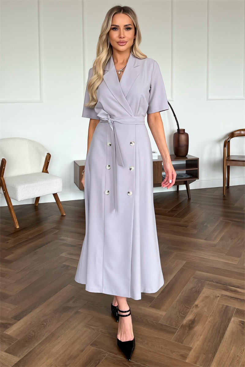 Элегантное платье приталенного силуэта выполнено из плательно-костюмной ткани. Горловина оформлена английским воротником. По переду выполнена двубортная застежка на петли и пуговицы. Рукав втачной, короткий. Модель отрезная по линии талии. Пояс из основной ткани в комплекте. Рекомендуемая стирка при t не более 30°. Длина изделия: 126 см Длина рукава: 27 см Ткань: плательно-костюмная. Рост фотомодели: 168 см Размер фотомодели: 42