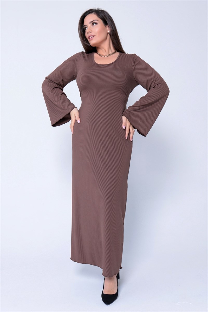 - Длинные расклешенные широкие рукава добавляют изысканности обтягивающему платью в рубчик и гармонично завершают композицию.