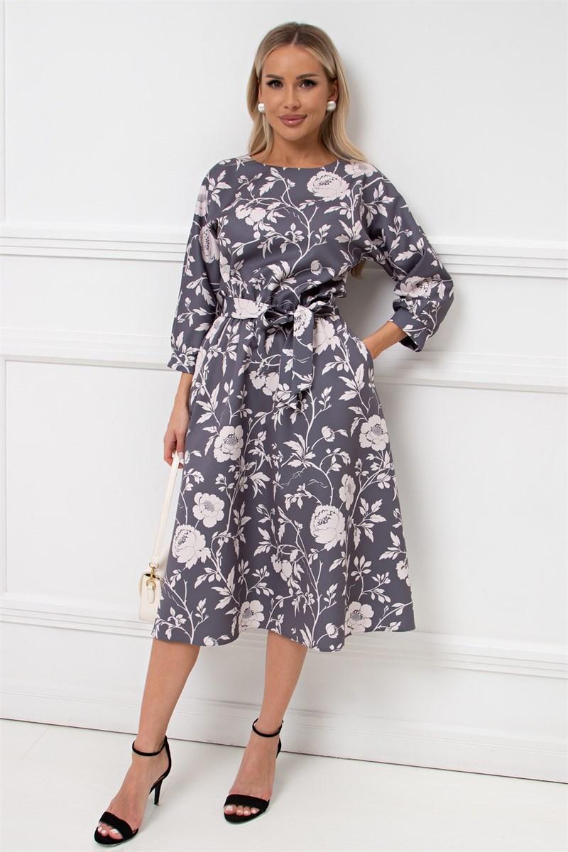 Женственное платье приталенного силуэта из плательно - костюмной ткани. Округлая горловина на внутренней обтачке. Цельнокроеный рукав - летучая мышь оканчивается притачной манжетой. Модель отрезная по линии талии присборена на резинку. Юбка расклешенного силуэта в боковых швах функциональные карманы. Низ ровный, без разрезов. Пояс из основной ткани в комплекте. Пояс пришит для того, чтобы в процессе примерки не потерялся, его можно отпороть. Рекомендуемая стирка при t не более 30°. Длина изделия: 109 см Длина рукава от горловины: 52 см Рост фотомодели: 168 см Размер фотомодели: 42 Ткань: Плательно - костюмная Мартьяно