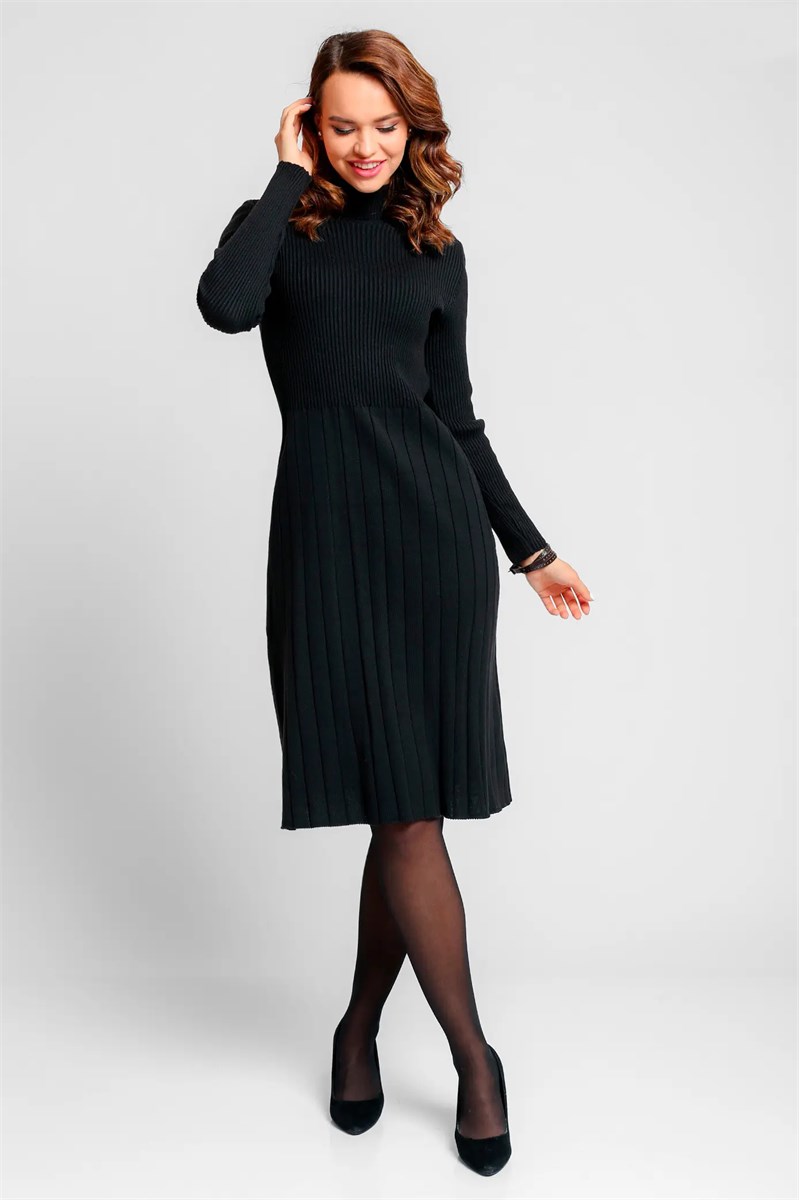 Трикотажное платье облегающего силуэта длиной до колена. Невысокий одинарный воротник-стойка. Рукава втачные длинные. Платье выполнено сочетанием двух видов эластичных переплетений.