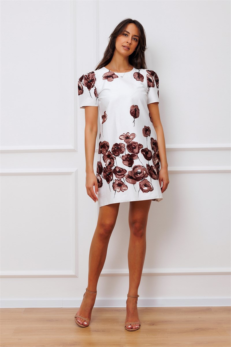 Нежное платье-мини прямого кроя. Модель украшена контрастным цветочным принтом. Такая модель замечательно подойдет для создания женственного образа на каждый день. Рукав короткий. Горловина округлая. Состав: 95% полиэстер, 5% эластан. Длина изделия 82 см. Рост модели на фото 173 см (+ каблук).