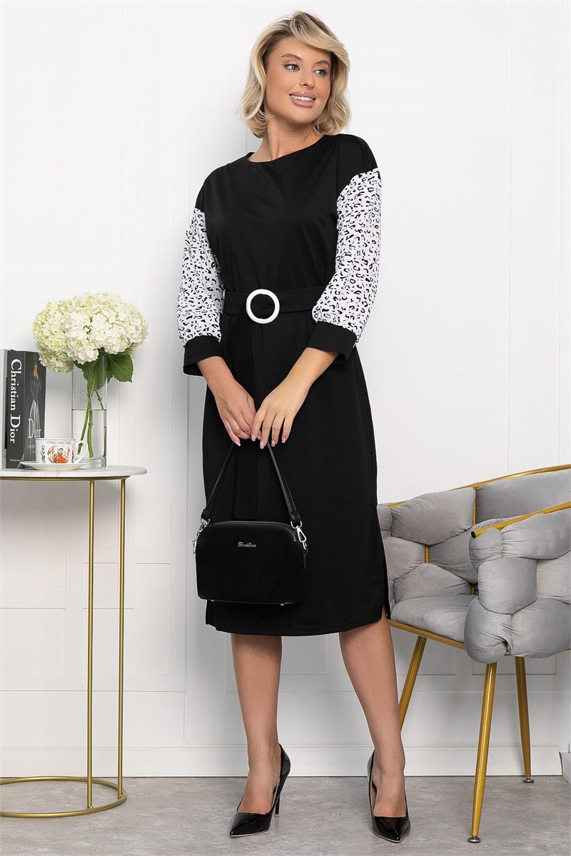 Платье средней длины с разрезами по бокам идеально подойдет для создания элегантного и утонченного образа. Округлый вырез и приспущенные плечи придают модели лёгкость и элегантность. Рукав длиной 3/4 заканчивается манжетой из основной ткани, создавая гармоничный образ. Платье выполнено в классическом чёрно-белом цвете, что делает его универсальным для любого случая. Особое внимание привлекает белая пряжка на поясе, которая добавляет изюминку и подчёркивает талию. Благодаря прямому крою, это платье стройнит и подходит для любого типа фигуры, обеспечивая комфорт и уверенность в себе.