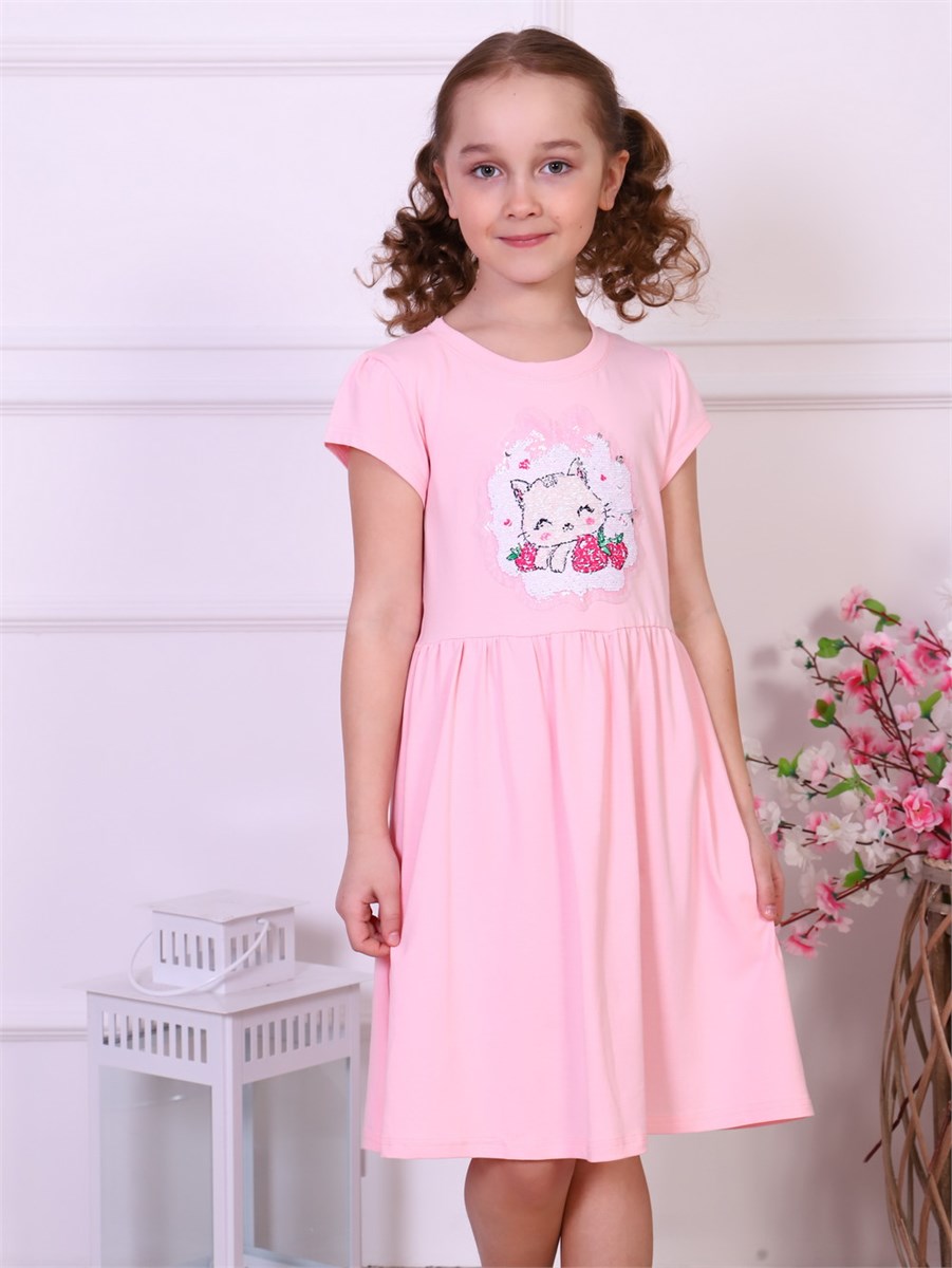 Милое и нежное платье для девочки с коротким рукавом. Бесспорный тренд этого сезона - изделия с пайетками - перевертышами. Модель декорирована нашивкой с пайетками, которые меняют свой цвет одним движением руки и создают веселое настроение. Это платье обязательно понравится юным модницам и станет самым любимым. Отлично подойдет для садика, для похода в гости или на праздник. Мягкий и приятный к телу материал. Для сохранения первоначальных свойств изделия, важно соблюдать рекомендации по уходу.