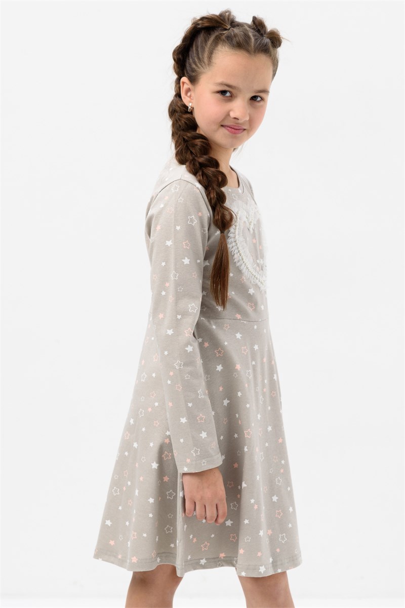 Платье для девочки в садик трикотажное с длинным рукавом, расклешенное от линии талии, спереди на верхней нашито кружево в виде сердца прилегающего силуэта, отрезное и расклешенное от линии талии. Сшито из мягкого трикотажного полотна с рисунком с добавлением в состав хлопка 92% и лайкры 8 %. Идеально для детского сада, для прогулок, для праздника и на каждый день, обладает прочностью, которая позволяет Вашей девочке активно играть и веселиться, не ограничивая движения. Прекрасная посадка позволяет использовать, как повседневное, а ещё наше платье для девочки не имеет застежек, что делает его легким в надевании и снятии, ребёнок сможет самостоятельно одеваться и чувствовать себя самой красивой принцессой. В нашей одежде не будет жарко в период включенного отопления осенью, весной и зимой.