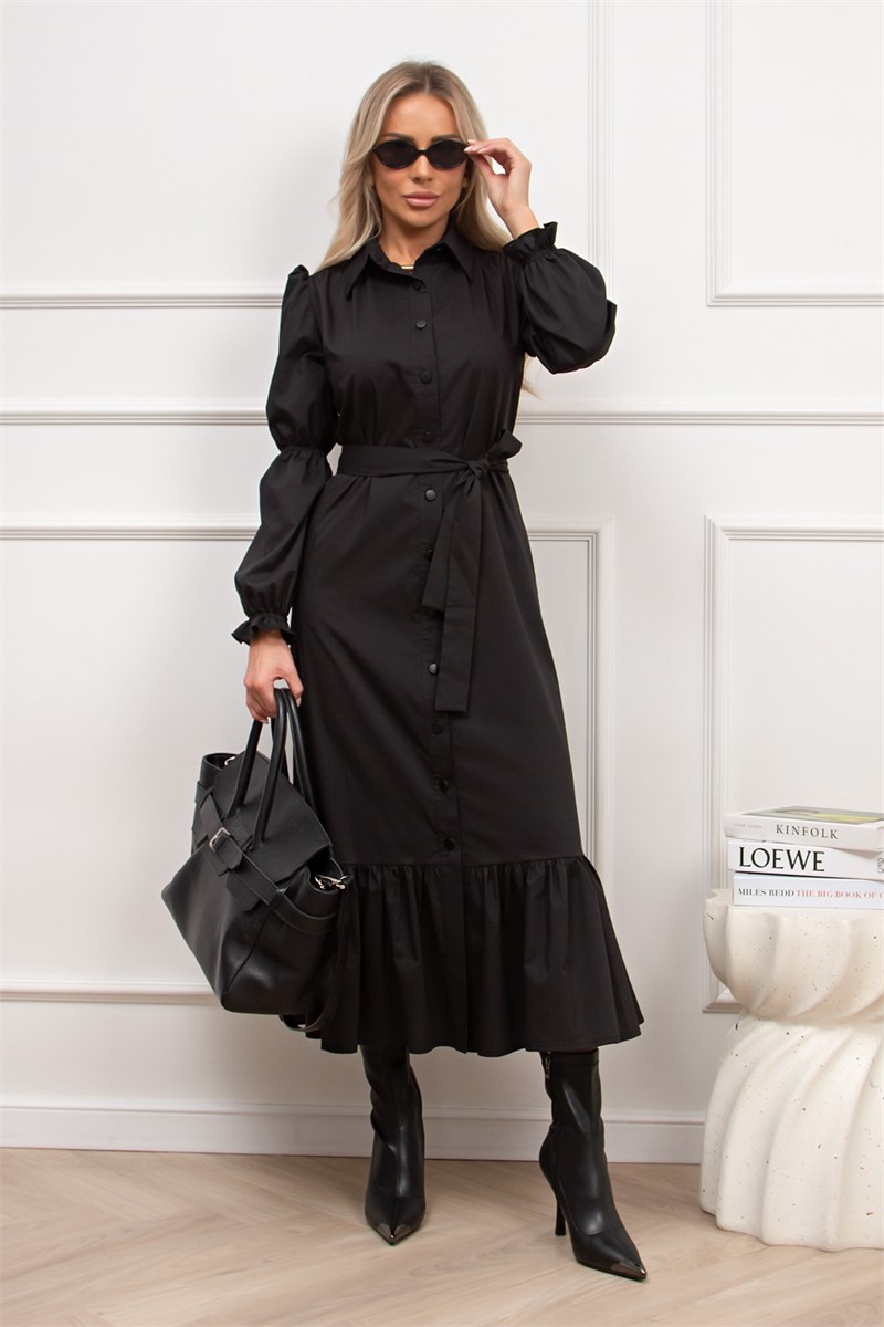 Женственное платье прямого силуэта. Горловина оформлена отложным воротником на стойке. По переду планка с застежкой на петли и пуговицы. Длинный втачной рукав со сборкой по окату, по низу присборен на шпульную резинку. В боковых швах функциональные карманы. Низ оформлен притачным воланом. Пояс из основной ткани в комплекте. Рекомендуемая стирка при t не более 30°. Длина изделия: 125 см. Длина рукава: 63 см. Ткань: хлопок. Рост фотомодели: 168 см Размер фотомодели: 42